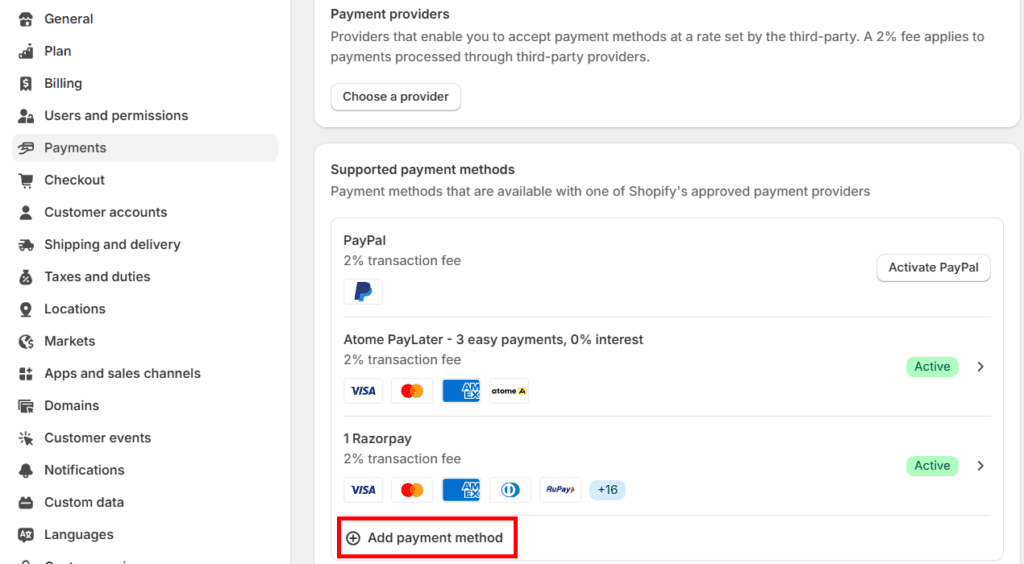 Go to “settings” on the bottom left of your Shopify admin dashboard, and click on “payments” and then “add payment method”