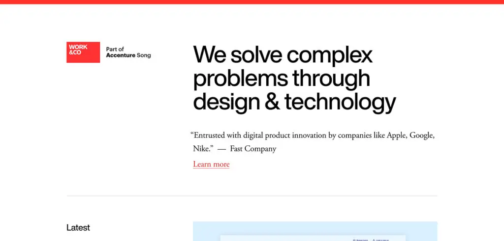 Work & Co is a design and technology agency that builds impactful digital products and platforms from strategy to launch. Known for its collaborative and hands-on culture, Work & Co has helped leading global brands reinvent their digital presence. With Accenture’s acquisition in 2024, Work & Co now combines boutique craftsmanship with global scale, maintaining its reputation for design excellence and socially conscious projects.